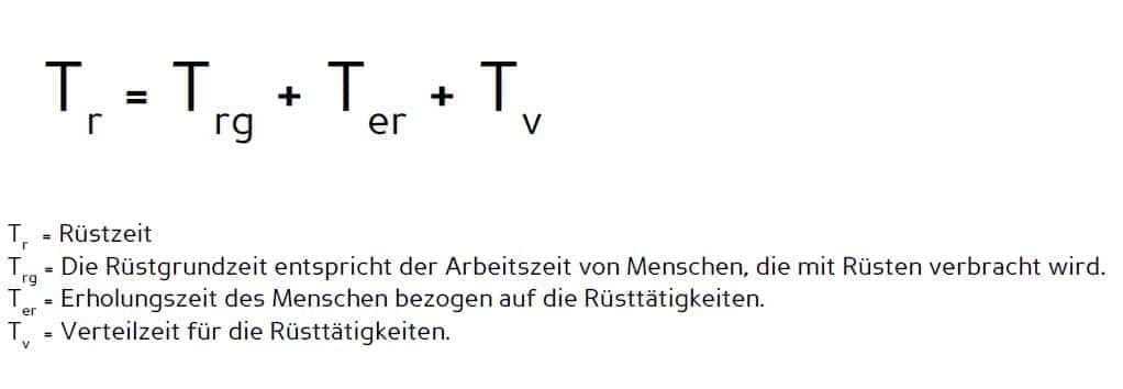 Nach REFA ist „t“ die Zeit, die bei der Vorbereitung eines Auftrages oder einer Serie einmal anfällt; d.h. die Vorbereitung des Arbeitssystems, sowie das Rückversetzen des Arbeitssystems in den ursprünglichen Zustand. Die Rüstzeit besteht aus Rüstgrundzeit, Rüsterholungszeit und Rüstverteilzeit. REFA hat als wesentliches Ziel, die Ermittlung von Planzeiten; es steht also eine synthetische Betrachtungsweise im Vordergrund. Um diese Definition auf ihre Anwendbarkeit zur Analyse von Rüstabläufen zu erweitern, untergliederte das IFA (Universität Hannover) die Rüstzeit in